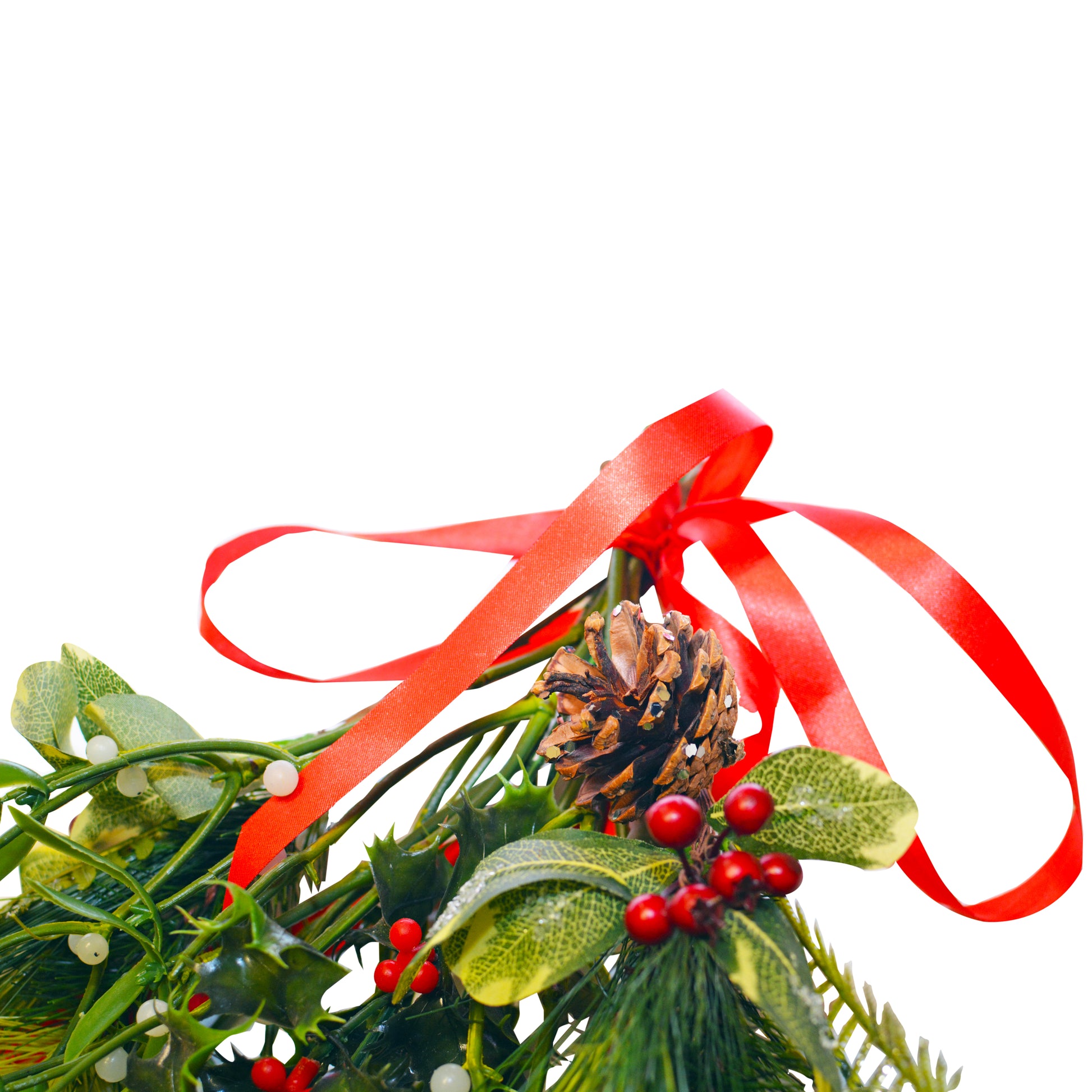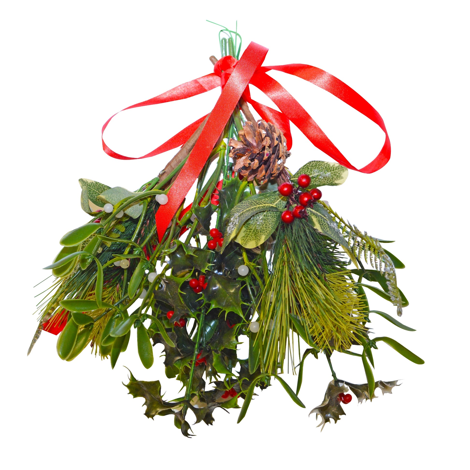 A handmade artificial arrangement of 8 Sprigs made up of festive foliage including holly, Mistletoe, fern and pinecones. Tied with festive ribbon.